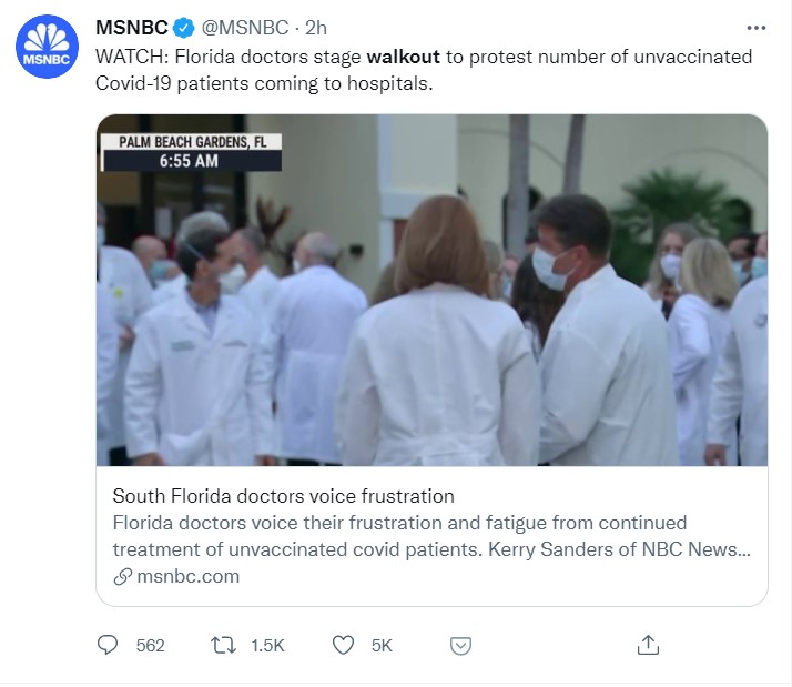 How your misinformation sausage gets made: News outlets and commentators across the political spectrum are making hay of the supposed walkout by doctors at a Palm Beach County hospital this morning, in response to Florida's surge of Covid cases among the unvaccinatedpic.twitter.com/KIZiVSHUEV