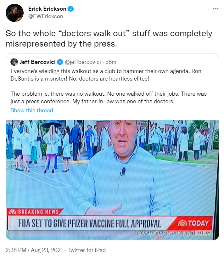 Everyone's wielding this walkout as a club to hammer their own agenda. Ron DeSantis is a monster! No, doctors are heartless elites! The problem is, there was no walkout. No one walked off their jobs. There was just a press conference. My father-in-law was one of the doctors.pic.twitter.com/FFbZGqCt5j