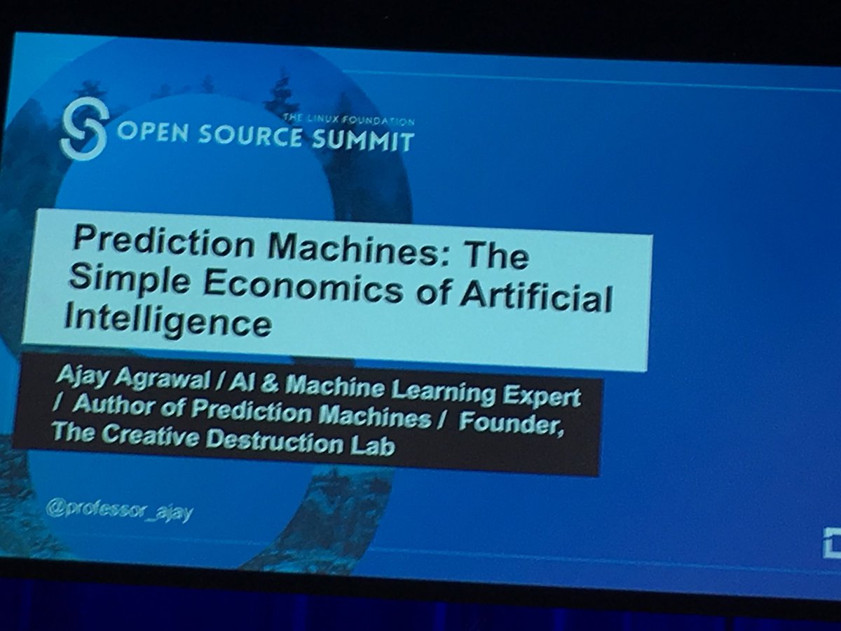 Now @professor_ajay talking #AI at @UofT at #OSSummit “What does this thing reduce the cost of?” #MooresLaw #MachineLearning @linuxfoundation “Reducing the cost of prediction”pic.twitter.com/TjDiIK38mT