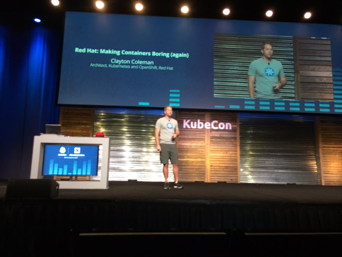 Now @smarterclayton talking "Making Containers Boring (again)" @CloudNativeFdn #KubeCon Nice talk by Clayton Shout out to @RedHatopen folks @linuxfoundationpic.twitter.com/LcgwptAWFu