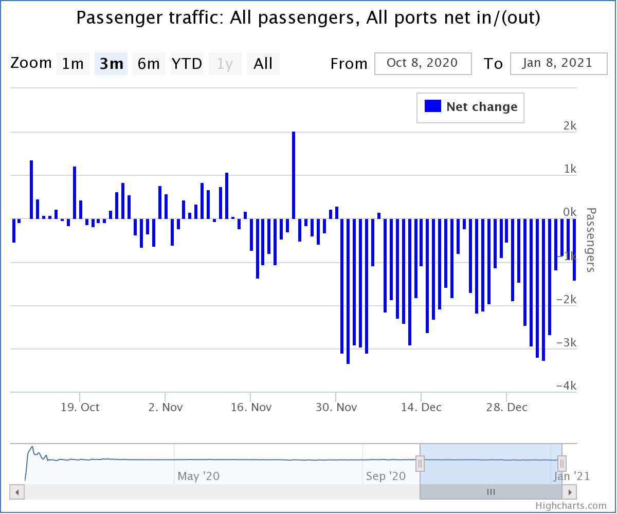 With the Xmas holidays over and some HKers stranded overseas or choosing not to return, we can tell you that since 1-Dec to 8-Jan, a net 75,100 passengers have left