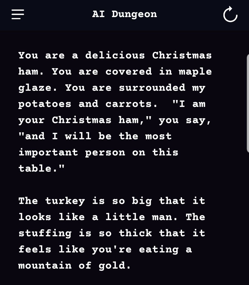 This is one of the most amazing http://aidungeon.io use cases I've seen yet.https://twitter.com/eturner303/status/1216476218603630592 …