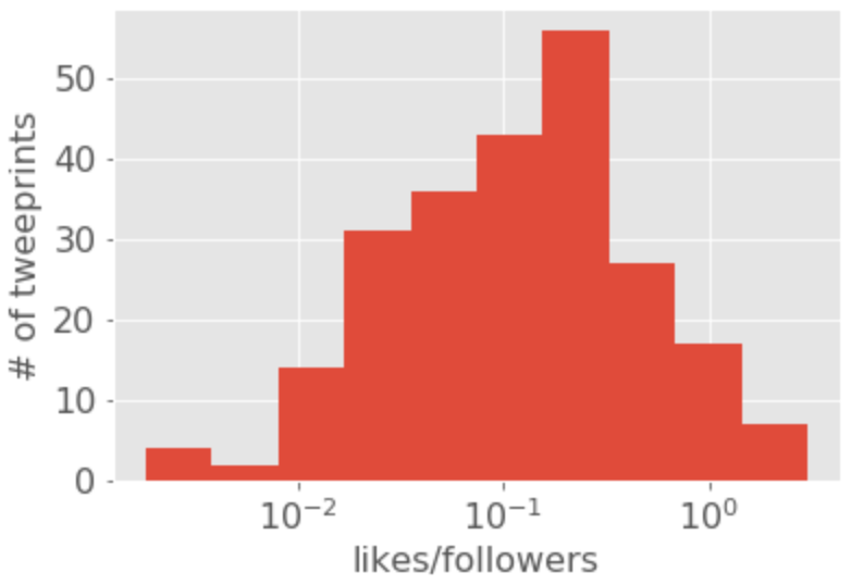 Of course, the more followers you have, the more attention your tweeprint will get. Of users with the 10 most-liked tweeprints, the median number of followers was 7k. (All but two of those users were PIs!) Of all 251 tweeprints, the median was 0.13 likes per follower. (6/n)pic.twitter.com/hRzFK6Xmtw