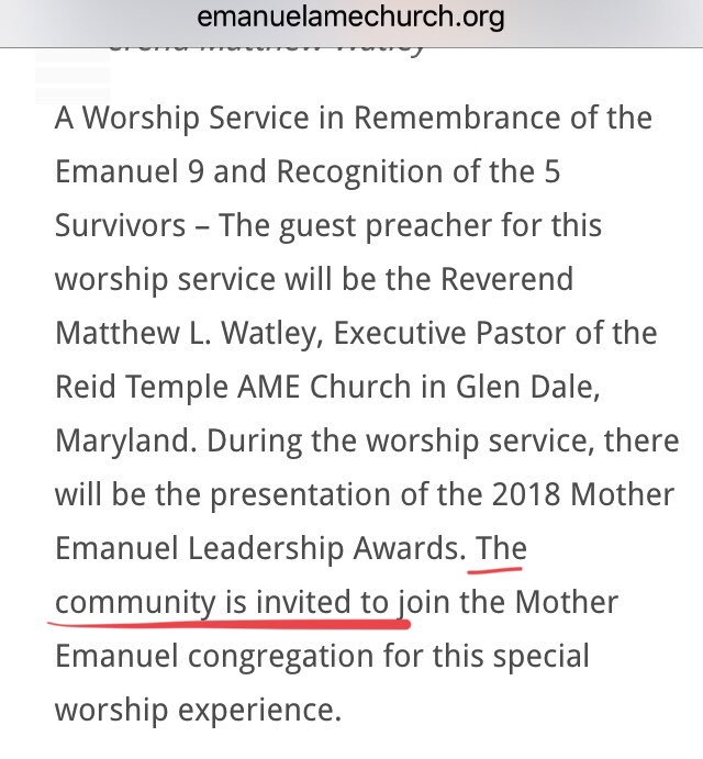 Special service this morning at Emanuel AME in Charleston: http://www.emanuelamechurch.org/event/morning-ecumenical-worship-service/ …pic.twitter.com/h6cBY5e8jg