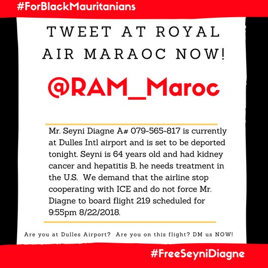 @RAM_Maroc your inaction will deport a man to his death! Do the right thing and cancel Seyni Diagne's flight. Don't cooperate with@ICEgov. Do not force Seyni to board flight 219@Dulles_Airport tonight for Morocco.#HeretoStay#Not1Morepic.twitter.com/3JAOx4tr9G