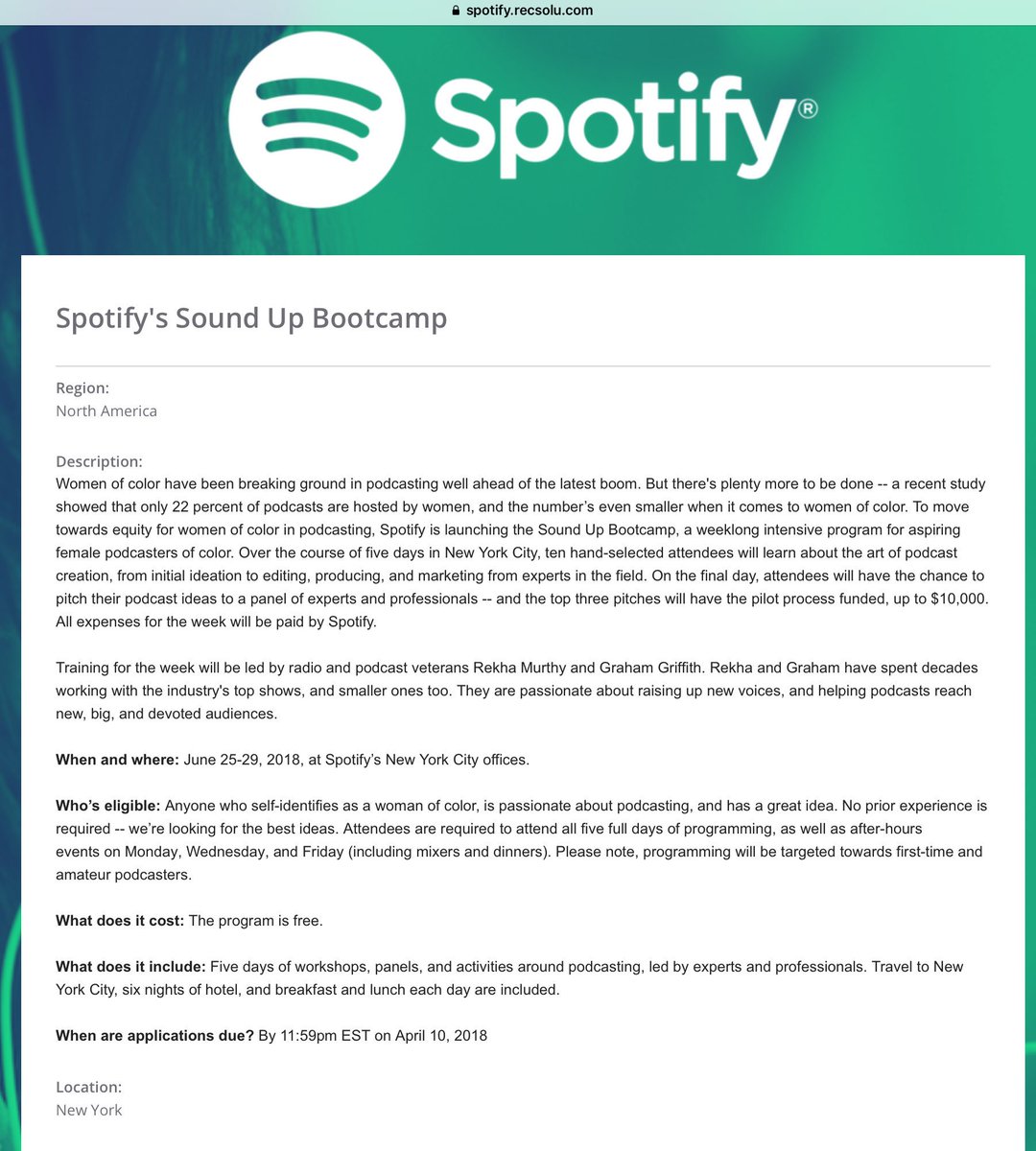 @spotify is offering an all-expenses paid trip to NYC to train women of color who want to make podcasts, with potential money for piloting at the end. Apply for Spotify Sound Up Bootcamppic.twitter.com/cgVRDFYOCL