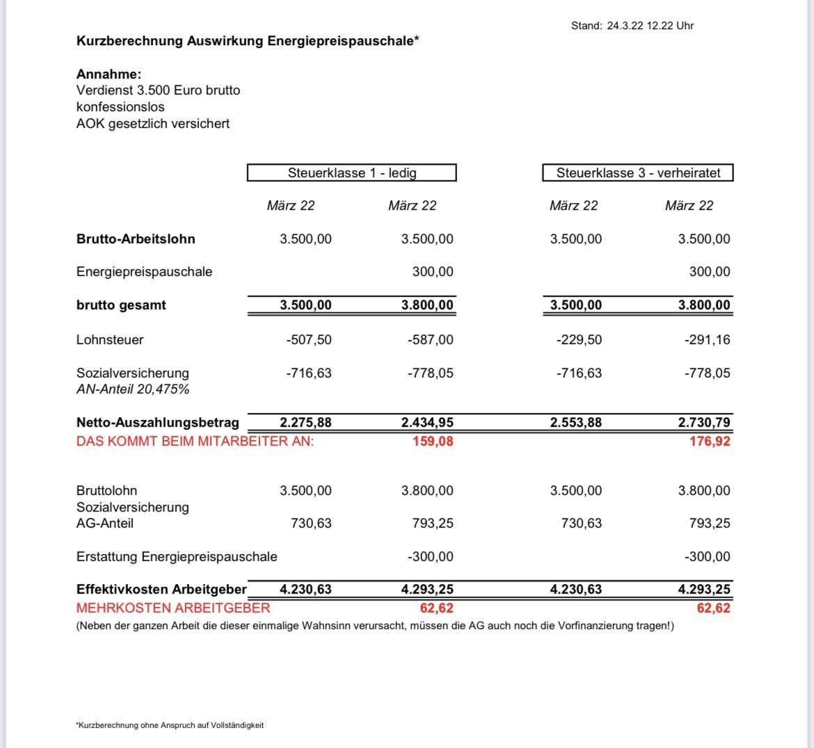 Grob gerechnet: Bei Gehalt von 3500€ brutto kommen von 300€ Energiepauschale bei Ledigen netto 159€ an, bei Paaren 177€. Der Arbeitgeber zahlt übrigens jeweils 62€ mehr an Abgaben. Da muss die Koalition nachsitzen. Sonst wird das für die Bürger eine ziemliche Mogelpackung.pic.twitter.com/hrKCinacJu