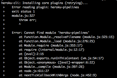 sigh. Heroku releases Pipelines and breaks their CLI and my CI. (`Error: Cannot find module ‘heroku-pipelines’`)pic.twitter.com/7AX14dpXtP