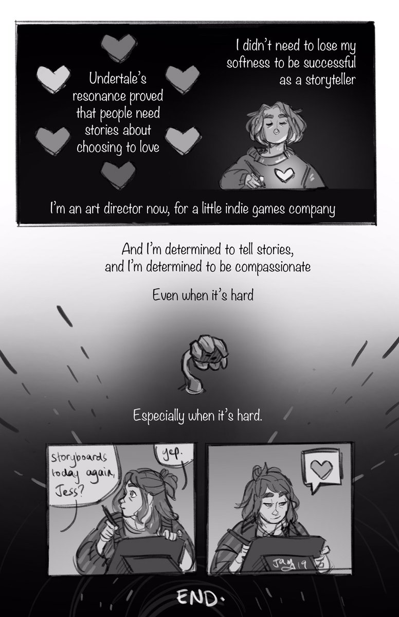 My comic for the Despite Everything zine, an Undertale-themed collaboration organised by @sfemonster a lil bit ago, about how it helped its players My part is about determination, holding onto compassion in a creative career, and what games can have to say about love 🖤pic.twitter.com/YnsdlFPxrM