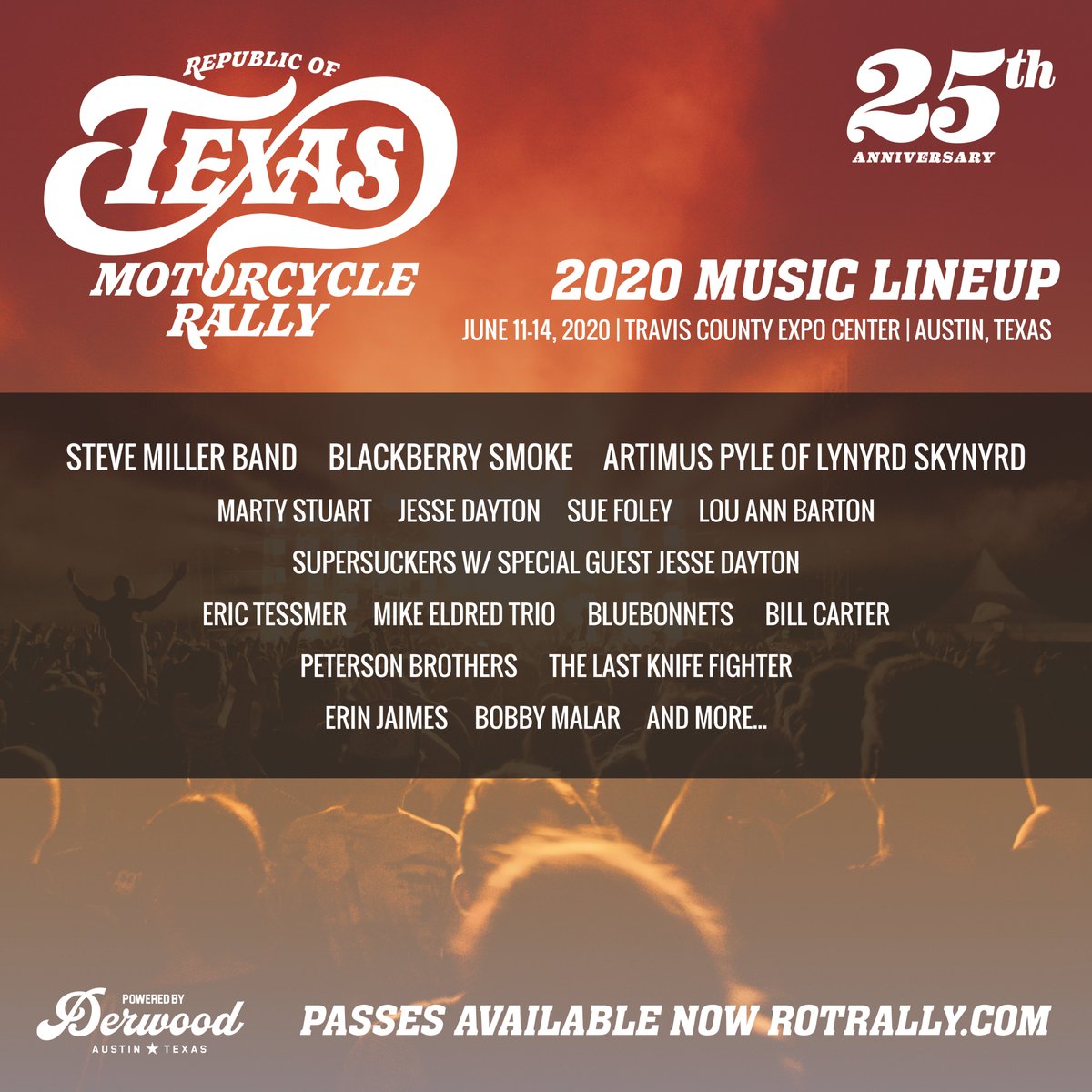 #TexasMusic legend@SMBofficial, along w/TX music heroes@JesseDayton,@SueFoleyMusic,@BillCarterBlame,@PetersonBros, and many more will rock the 25th annual Republic of Texas Rally, June 11-14 at@TravCoExpoCtr. Learn more: https://austin360.com/entertainment/20200226/steve-miller-band-blackberry-smoke-will-rock-2020-republic-of-texas-rally … via@statesman#rotrallypic.twitter.com/oj7R4Q1JBU