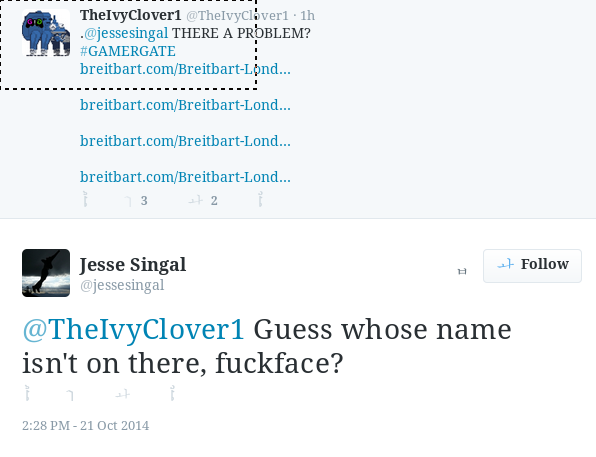 To me @KachoArinoDesu , it looks like @jessesingal called @TheIvyClover1 a "fuckface" because she didn't agree w/ Ivy's links? Seem right?