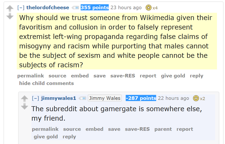 Jimmy Wales responds to a GamerGater sea-lioning a reddit AMA and get's massively downvoted... #StopGamerGatepic.twitter.com/yYQLXR9kvH