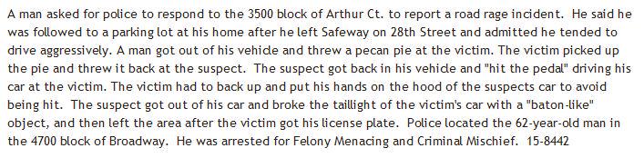 A 62-year-old man got arrested in #Boulder for reportedly throwing a pecan pie at someonepic.twitter.com/1NClj6tE7J