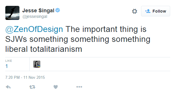 .@jessesingal That's rich coming from mr. "Hurr conservative reactionary right-wing GamerGate MRA dog whistle."pic.twitter.com/ABEgc7PrOg