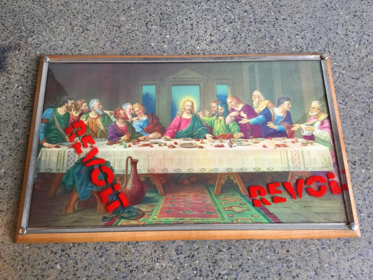 This artist seems to go by the name REVOLT. I started noticing all kinds of spray painted vinyl covers & framed pictures in my neighborhood that were spray painted with this tag. Physical graffiti you can take? Brilliant idea! Had to grab it behind a wire fence. 😎🎧🌎📡🎶🛰pic.twitter.com/nfzhhcrGzo