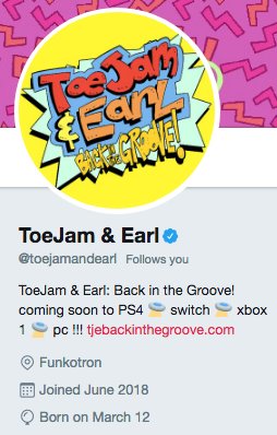 I’ve just realized that “ToeJam & Earl” is following me. @toejamandearlpic.twitter.com/y3UFLwtHal