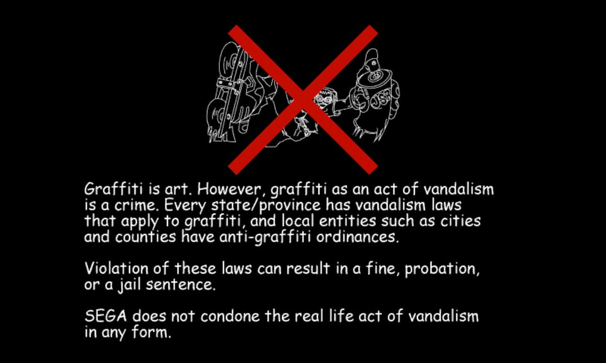 just remembered Jet Set Radio's opening disclaimer is 'graffiti is art but also it's a crime don't do it'. and I always liked how that was phrased as an implicit endorsement