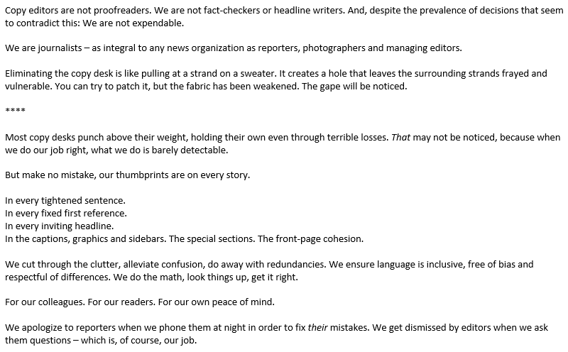 Copy editors are the unsung heroes of print and digital journalism. Our newsrooms need more, not less. (This opinion is cq.)https://twitter.com/cschrappen/status/1123737939740102657 …