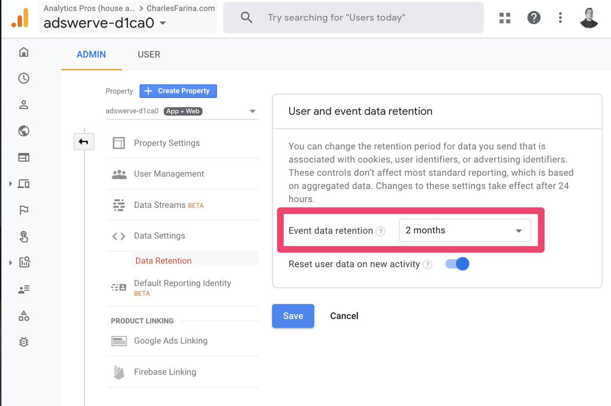 @googleanalytics new App+Web properties make sure you check your data retention settings. By default, it is set to 2 months. The only other option is 14 months, which is the maximum.pic.twitter.com/WbvtUllkxE
