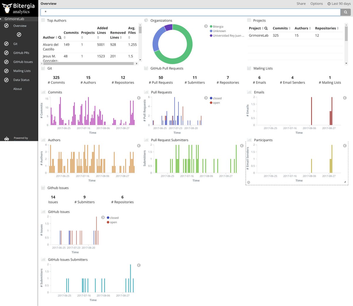 GrimoireLab analyzing GrimoireLab http://grimoirelab.biterg.io & CHAOSS as a whole http://chaoss.biterg.io #OSSummitpic.twitter.com/BctV905bED