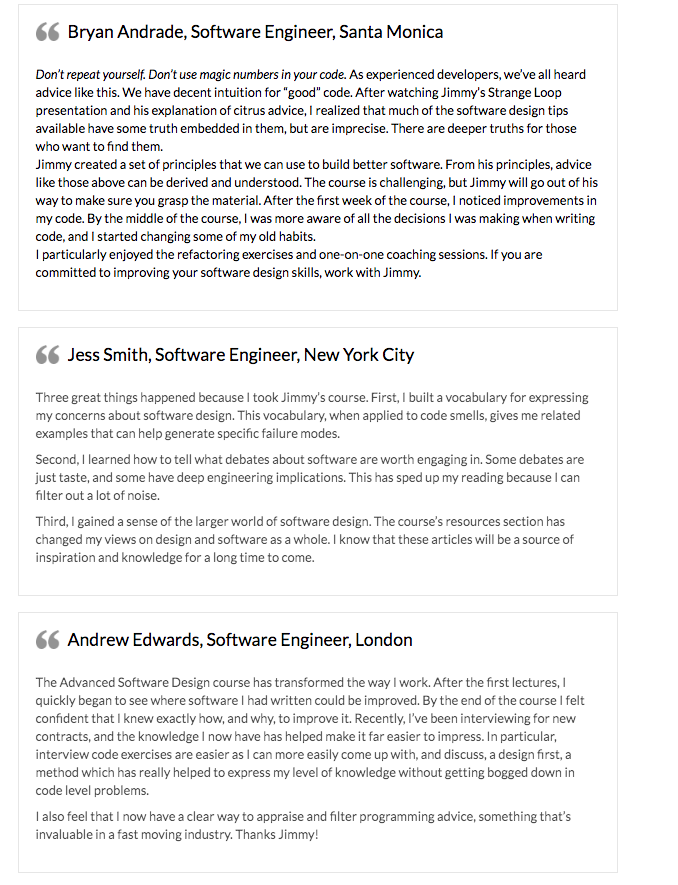 Proud to announce the next run of my Advanced Software Design Web Course, starting 8/23, is now accepting applications. Students continue to report massive benefits to their software engineering abilities, helping them both do and get the job. http://jameskoppelcoaching.com/advanced-software-design-web-course/ …pic.twitter.com/BsS9mXibbu