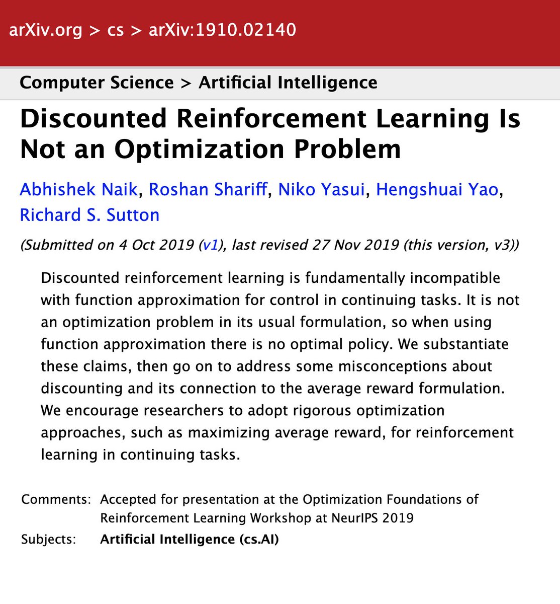 @anaik96 et al. presented at Optimization Foundations of RL workshop examined and questioned the role of discounting in great detail. The conclusions are quite interesting: https://arxiv.org/abs/1910.02140 pic.twitter.com/DnsSCkuewr
