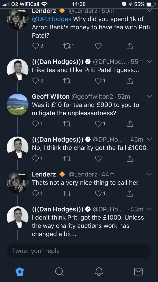 I’m guessing the screen grab re: Dan Hodges spending £1000 of Banks’ money to have tea with Priti Patel is real at least, given his response?pic.twitter.com/8wJRZFpdMg