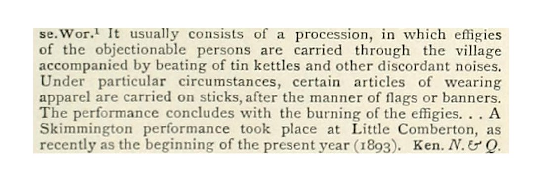 A SKIMMINGTON is an unpopular person. A SKIMMINGTON-RIDE is an old country ceremony in which effigies of an unpopular person are carried through town and burnt in derision or protest. (English Dialect Dictionary, 1898)pic.twitter.com/bgw9t3M9Vm