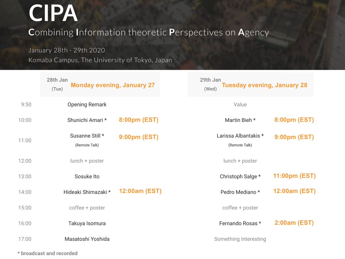 【Info】Combining Information-theoretic Perspectives on Agency(CIPA) workshop in Komaba, Tokyo will be broadcasted through Zoom links. The meeting URL link for 28th, Jan: https://zoom.us/j/491020425 The meeting URL link for 29th, Jan:https://zoom.us/j/755716995