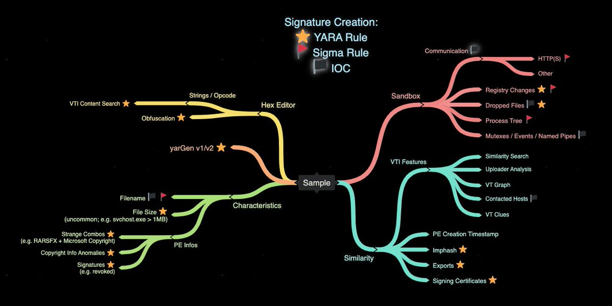 My Signature Creation Mind Map Input: Sample > the things that I check to create YARA signatures, Sigma rules or IOCs > or pivot to related samples in order to improve the signatures / rulespic.twitter.com/DcwYg0tZ6w