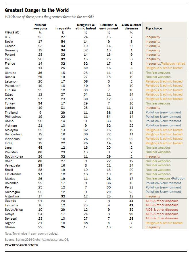 What do people in 44 countries see as the greatest dangers to the world? Check this chart: http://pewrsr.ch/1vik4xT pic.twitter.com/2EySgvQlvd