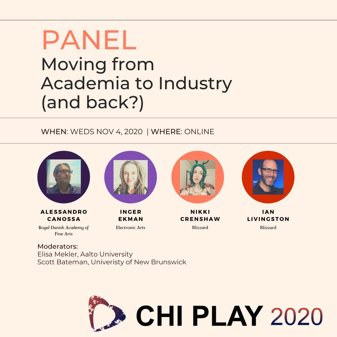 How is Games UX and UR work different from academic life? The 'Moving from Academia to Industry' panel will address panelists motivations for and experiences in moving from academia and to the games industry. Join us at 15:10 PM (EST) / 20:00 PM (UTC -5). https://buff.ly/38axlTu  pic.twitter.com/ELbly6nI6M