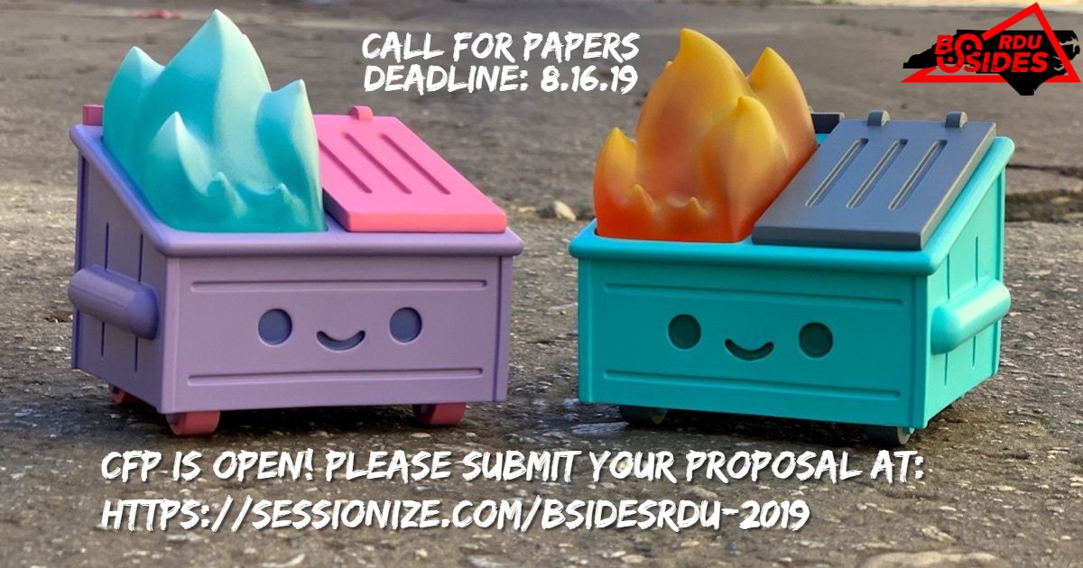 @BSidesRDU's 2019 theme is Security Dumpster Fire. Do you have a dumpster fire story? Know how to put out a dumpster fire? Do you have a perspective to share? We'd love to hear it. Submit your abstract by August 16th here: https://sessionize.com/bsidesrdu-2019/#CFP#BsidesRDU#dumpsterfirepic.twitter.com/eJXP0KDlQk