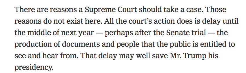A constitutional lawyer contends there is no good reason for SCOTUS to have accepted circuit courts cases involving Trump documents and testimony. He asserts the resulting delay is a vote in favor of Trump by the Court. Legal experts here agree?https://nyti.ms/2MwvUmS pic.twitter.com/uESylk8Kuh