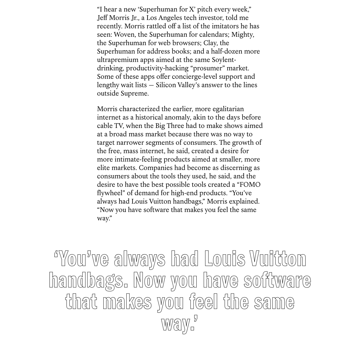 I spoke to New York Times Magazine about "Superhuman for X" startups: * Luxury software is the new Louis Vuitton * Early internet was like TV before cable. Now we have premium software * Software has waitlists & creates "fomo" that feels like Supreme https://www.nytimes.com/interactive/2019/11/13/magazine/internet-premium.html …pic.twitter.com/P0IF63hW4i
