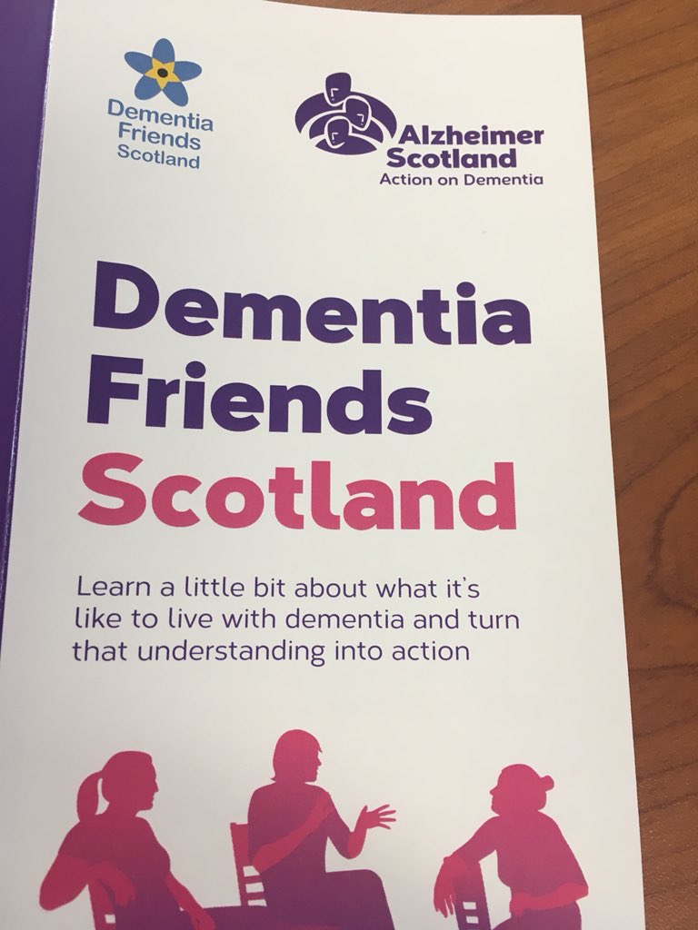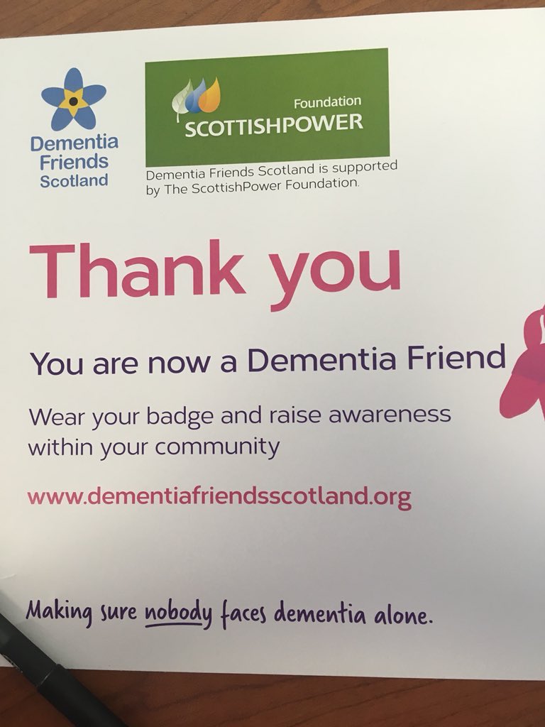 @alzscot Raising awareness of dementia and how we can all help. 1/3 of people >65 will have dementia. I’m now a Dementia Friend!pic.twitter.com/Sfn9rhk5bL