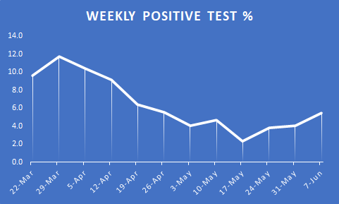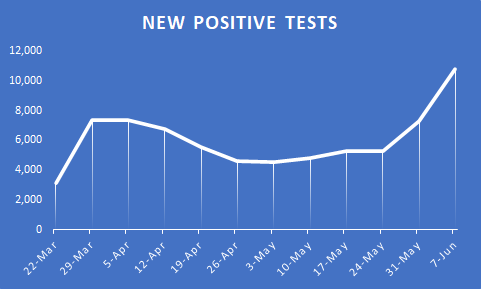 Here are the weekly numbers for the past 12 weeks, through yesterday. It had seemed like much of the recent rise was mostly attributable to more testing, but the positivity rate also jumped up pretty significantly this past week.pic.twitter.com/6IPzZ623qA