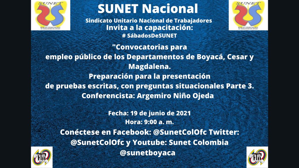 @CNSCColombia para la convocatoria de Boyacá, Cesar y Magdalena con@sunetcolofc el 11,12 y 19 de junio. Tema: Pruebas escritas con preguntas situacionales. Invitados: Expertos de@sunetcolofc. ¡No se las pierda!@GermanSUNETpic.twitter.com/lnCeQSk4HY