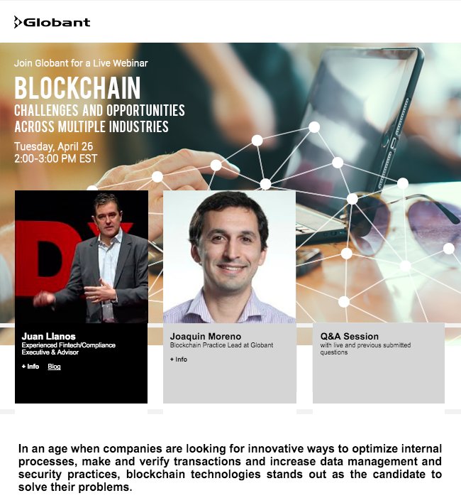 @Globant#blockchain webinar w/@JuanLlanos &@joaquinmoreno about its challenges/opportunities across multiple#industriesThanks. Twitter will use this to make your timeline better. Undo -