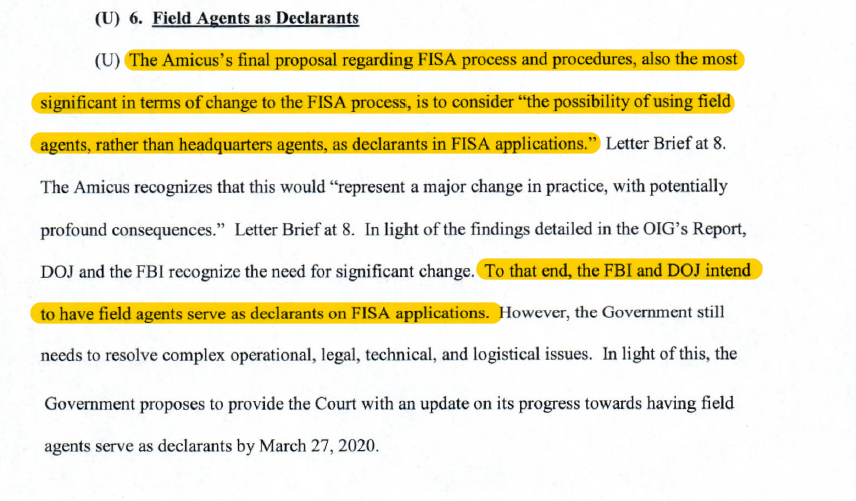 But also a big change: "The FBI and DOJ intent to have field agents serve as declarants on FISA applications."