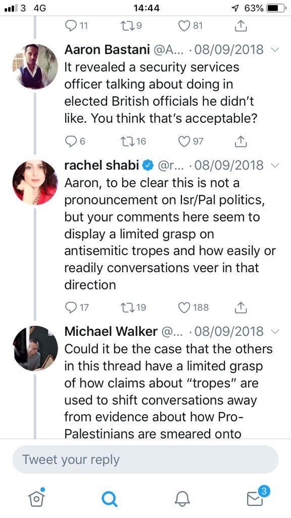 @AaronBastani bare for me is the one below, in which@rachshabi-his fellow Corbynista journalist-spokesman-felt compelled to explain to him publicly why what he’d said was antisemitic. He still failed to cede ground.https://twitter.com/aaronbastani/status/1037799743706079236?s=21 …