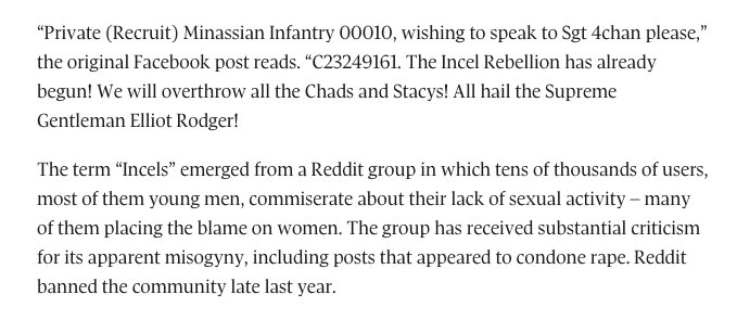 It sure looks like the Toronto van attacker was part of one of the most toxic digital subcultures out there. https://www.theglobeandmail.com/canada/article-facebook-post-connected-to-suspect-in-van-rampage-cites-incel/ …pic.twitter.com/zaL9cQjpfH