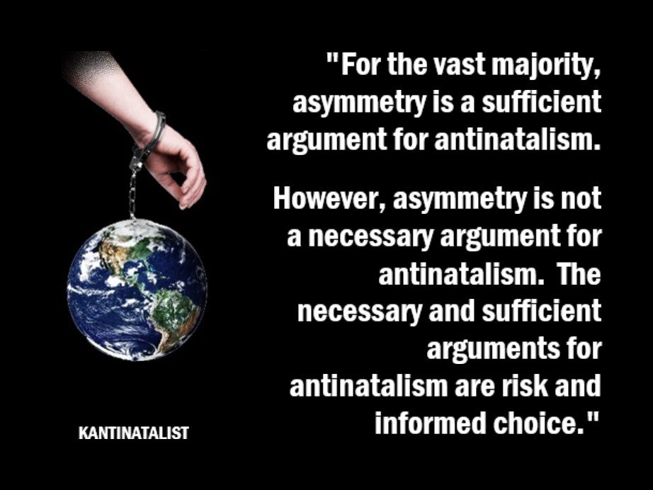 "For the vast majority, asymmetry is a sufficient argument for antinatalism. However, asymmetry is not a necessary argument for antinatalism. The necessary and sufficient arguments for antinatalism are risk and informed choice."