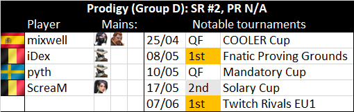 Prodigy: #1 or #2 to win it all. rotating cast of players around core of mixwell/ScreaM, indications are pyth/iDex/? this week. play more patiently than you'd think. watch out for mixwell's pocket Viper - uses on Bind/Ascent, idea in general is as setup for Operator, is v coolpic.twitter.com/MdHVJKyXjB