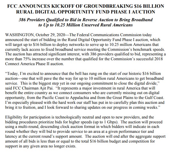 @FCC's Rural Digital Opportunity Fund Phase 1 auction is underway! This $16B initiative aims to bring broadband to up to 10.25M unserved#rural Americans. This is our boldest step yet to close the#digitaldivide. Auction info available at https://www.fcc.gov/auction/904 .pic.twitter.com/P27Hzg48Oj