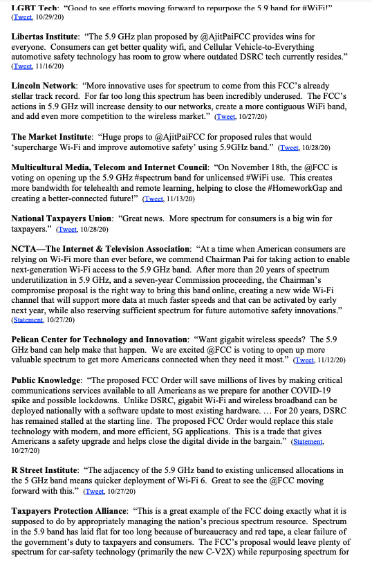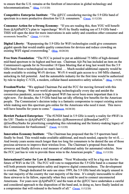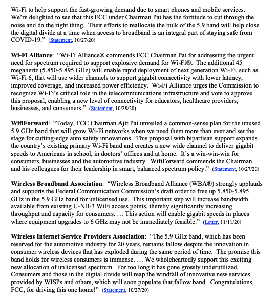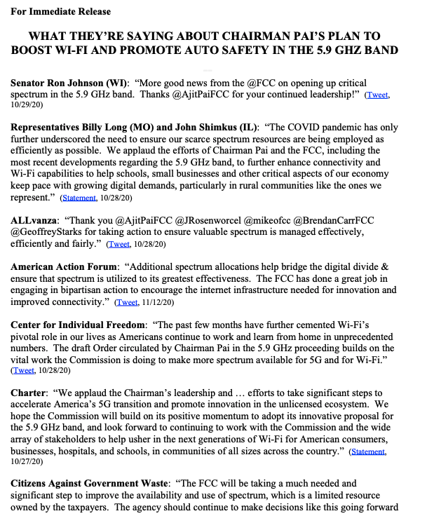 @AjitPaiFCC's plan to supercharge WiFi and promote auto safety in the 5.9 GHz band enjoys widespread support from across the political spectrum, including: