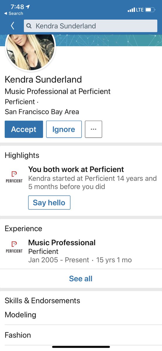 Is this what spearfishing looks like? No connections but experience in modeling and 15 years at Perficient as a music professional. What do they get out of this?