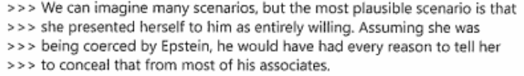 A few dozen professional readers don't all succumb to the same illiteracy at the same hour. The charge is that Stallman in the MIT emails claimed his victim was "entirely willing". That's just untrue because he stated that she was coerced and harmed.pic.twitter.com/boihIHki8n