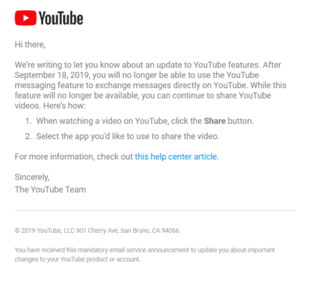 Precisely 2 years after introducing YouTube messaging, Google is killing it. As Google does. To everything.pic.twitter.com/8b3QsxLzNW