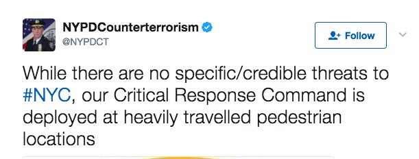 NYPD says they're deploying officers to "heavily traveled pedestrian locations" after London incidents. http://cbsn.ws/2qO29VC pic.twitter.com/Xkuyo4YgSB